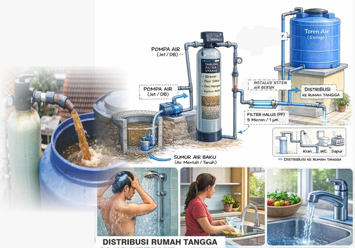 Oleh karena itu, diperlukan sistem pengolahan air bersih yang mampu mengubah air kotor dari sumber air baku menjadi air yang jernih, aman, dan higienis, sehingga layak digunakan untuk kebutuhan domestik maupun umum.