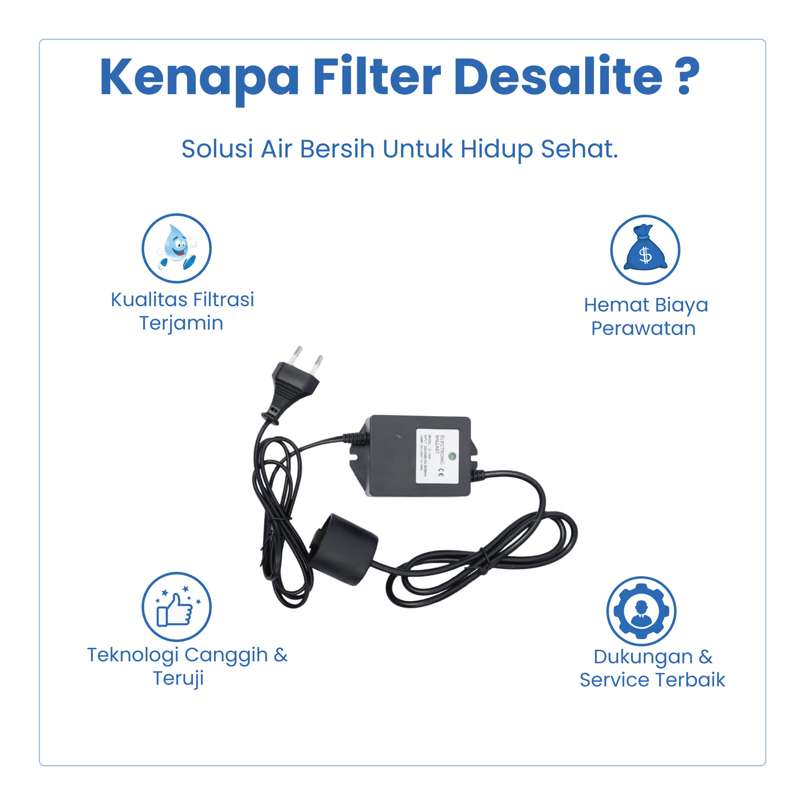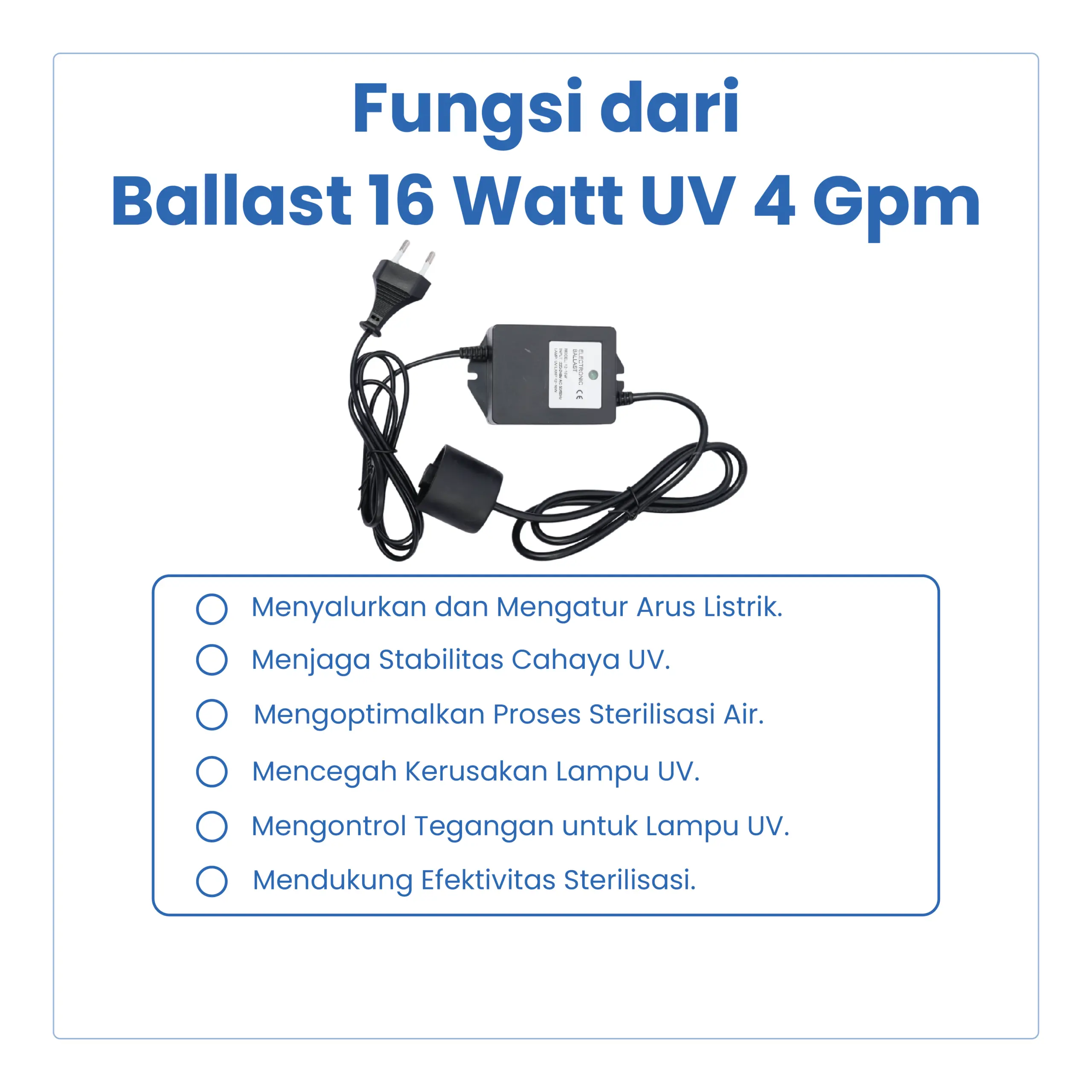 Ballast UV 16 Watt adalah power supply khusus untuk menghidupkan dan menstabilkan kinerja lampu UV pada sistem sterilisasi air kapasitas 4 GPM. Ballast ini berfungsi mengatur arus listrik agar lampu UV bekerja optimal, stabil, dan lebih awet.