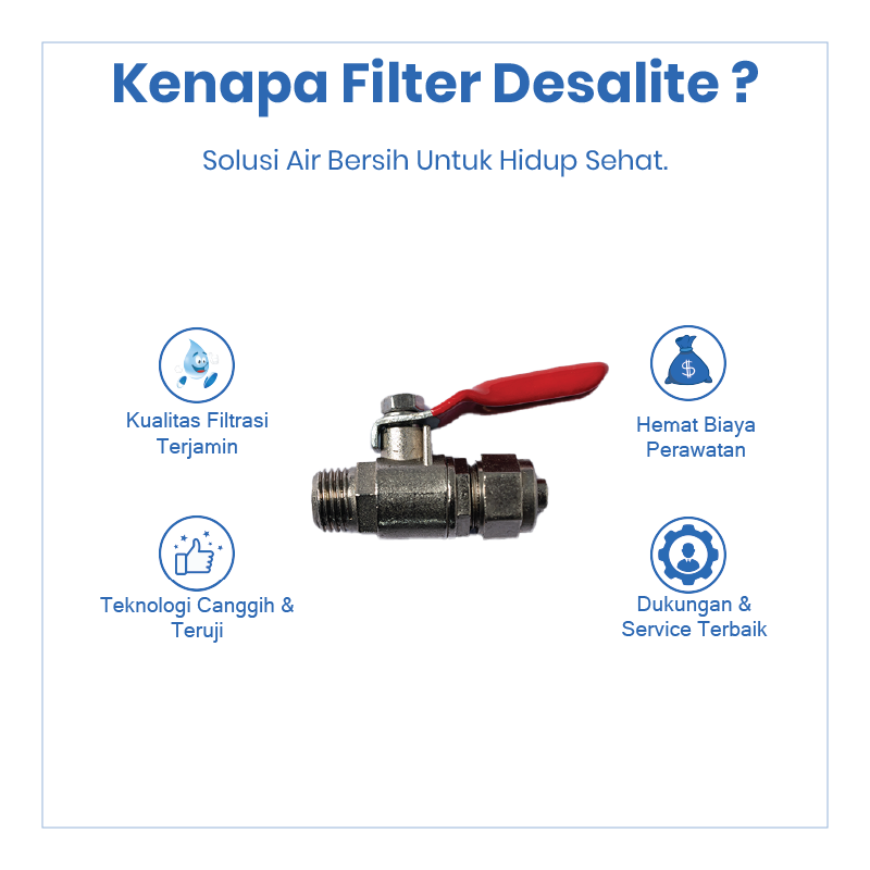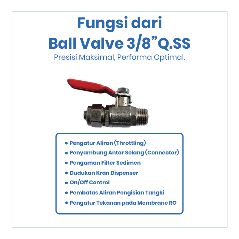 Ball Valve 3/8” Q SS merupakan kran air berbahan stainless steel yang digunakan untuk mengatur buka–tutup aliran air pada sistem Reverse Osmosis (RO) dan water treatment. Dengan koneksi quick 3/8”, valve ini memberikan sambungan yang kuat, rapi, dan tahan tekanan.