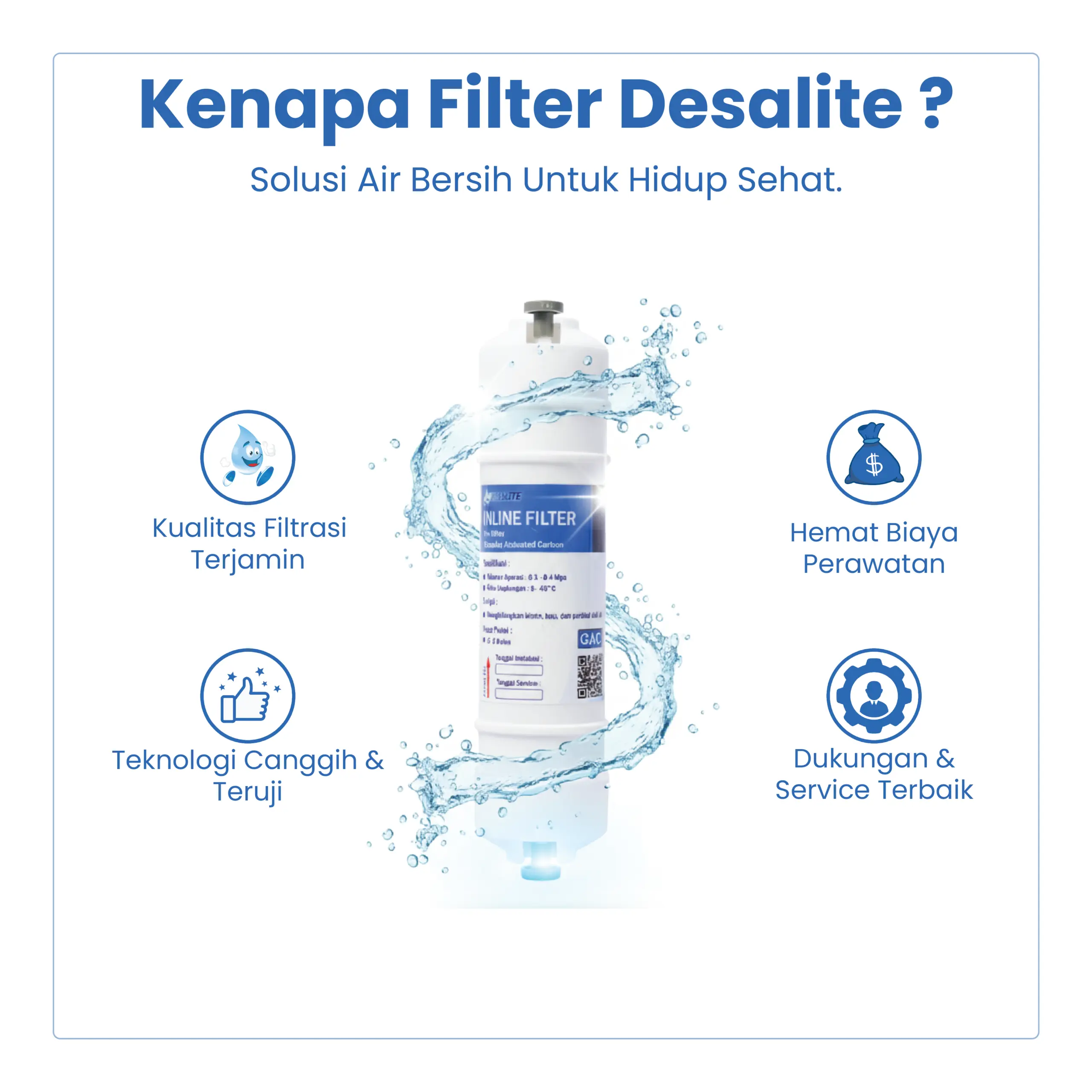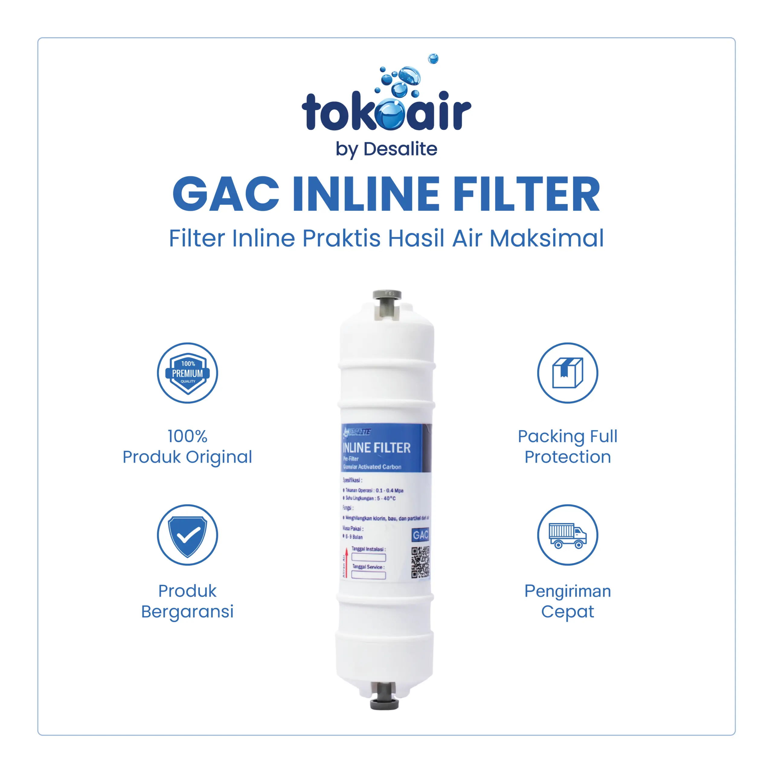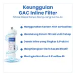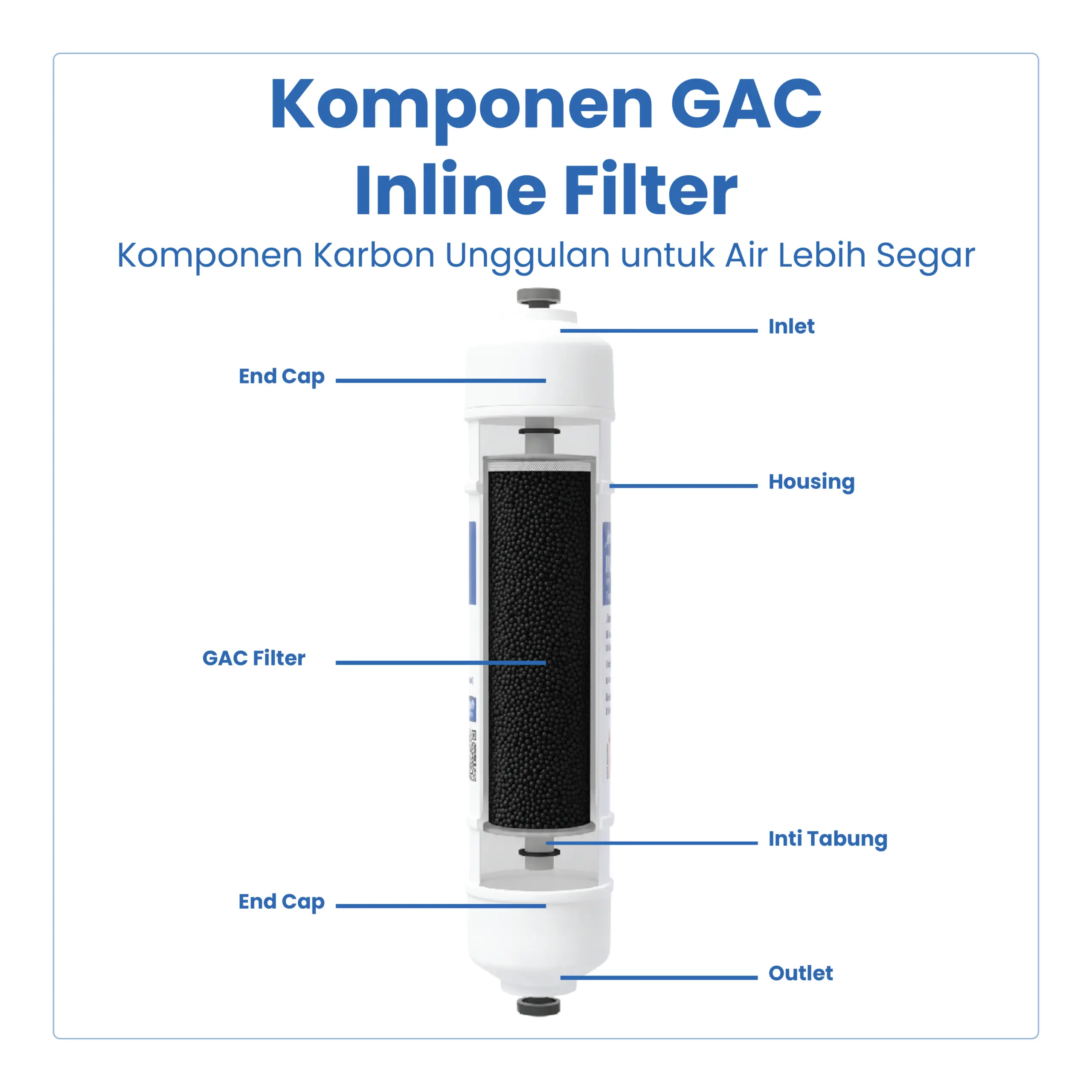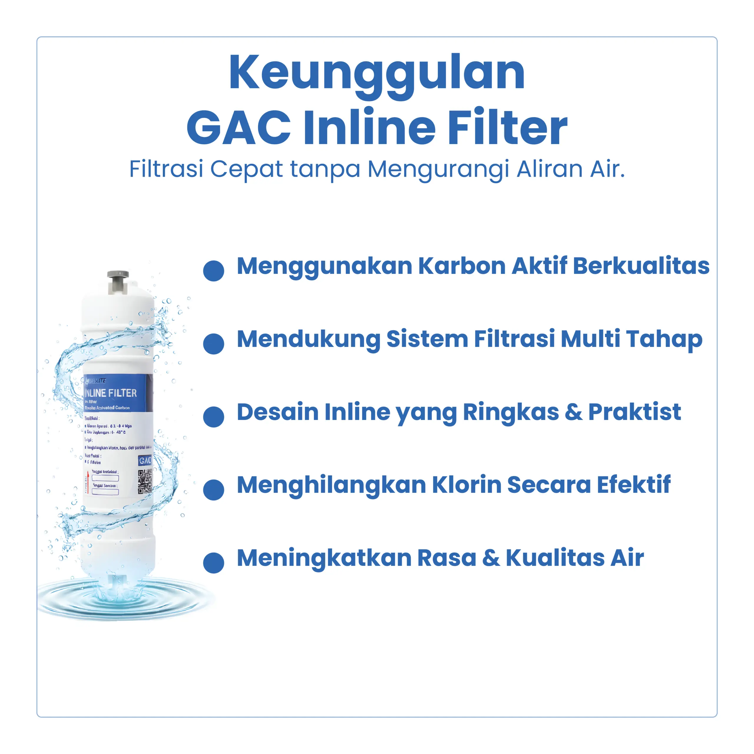 GAC Inline Filter merupakan filter air inline yang menggunakan media karbon aktif granular (GAC) untuk menyerap bau, rasa tidak sedap, klorin, serta zat organik dalam air. Filter ini berfungsi sebagai filter lanjutan untuk meningkatkan kualitas air sebelum digunakan atau dikonsumsi.