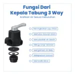 Kepala Tabung 3 Way merupakan kepala tabung filter air yang berfungsi mengatur alur masuk, keluar, dan pembuangan air dalam sistem filtrasi. Umumnya digunakan pada tabung media filter (pasir silika, karbon aktif, resin, bio) baik untuk kebutuhan rumah tangga maupun usaha.