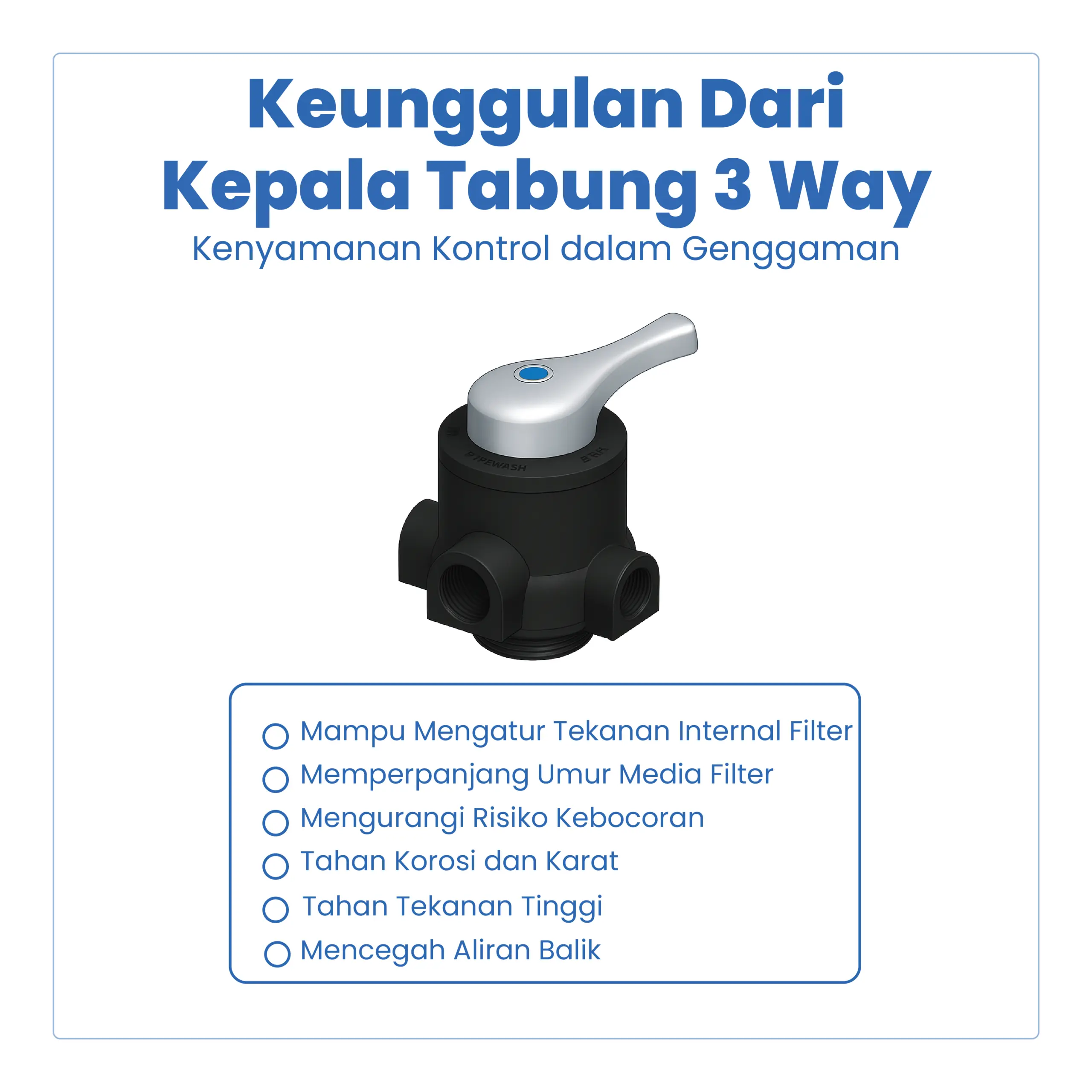 Desain 3 way memudahkan proses operasional, perawatan, dan backwash sehingga sistem filtrasi bekerja lebih optimal.