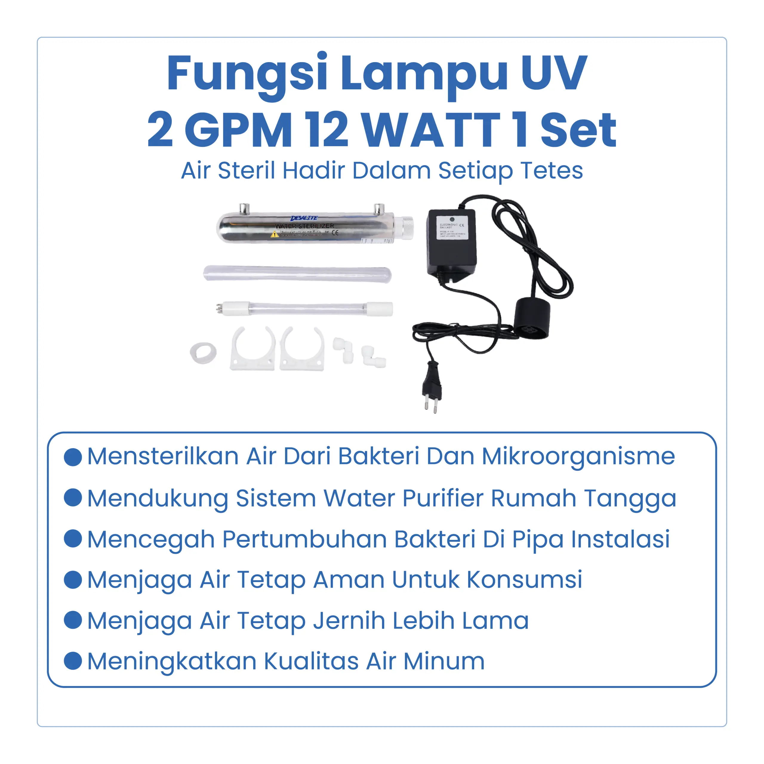 Lampu UV 12 GPM 12 Watt (1 Set) adalah perangkat sterilisasi air yang digunakan pada sistem water treatment dan Reverse Osmosis (RO). Lampu UV ini berfungsi untuk membunuh bakteri, virus, dan mikroorganisme berbahaya dalam air tanpa menggunakan bahan kimia, sehingga aman untuk kebutuhan air minum dan penggunaan sehari-hari.