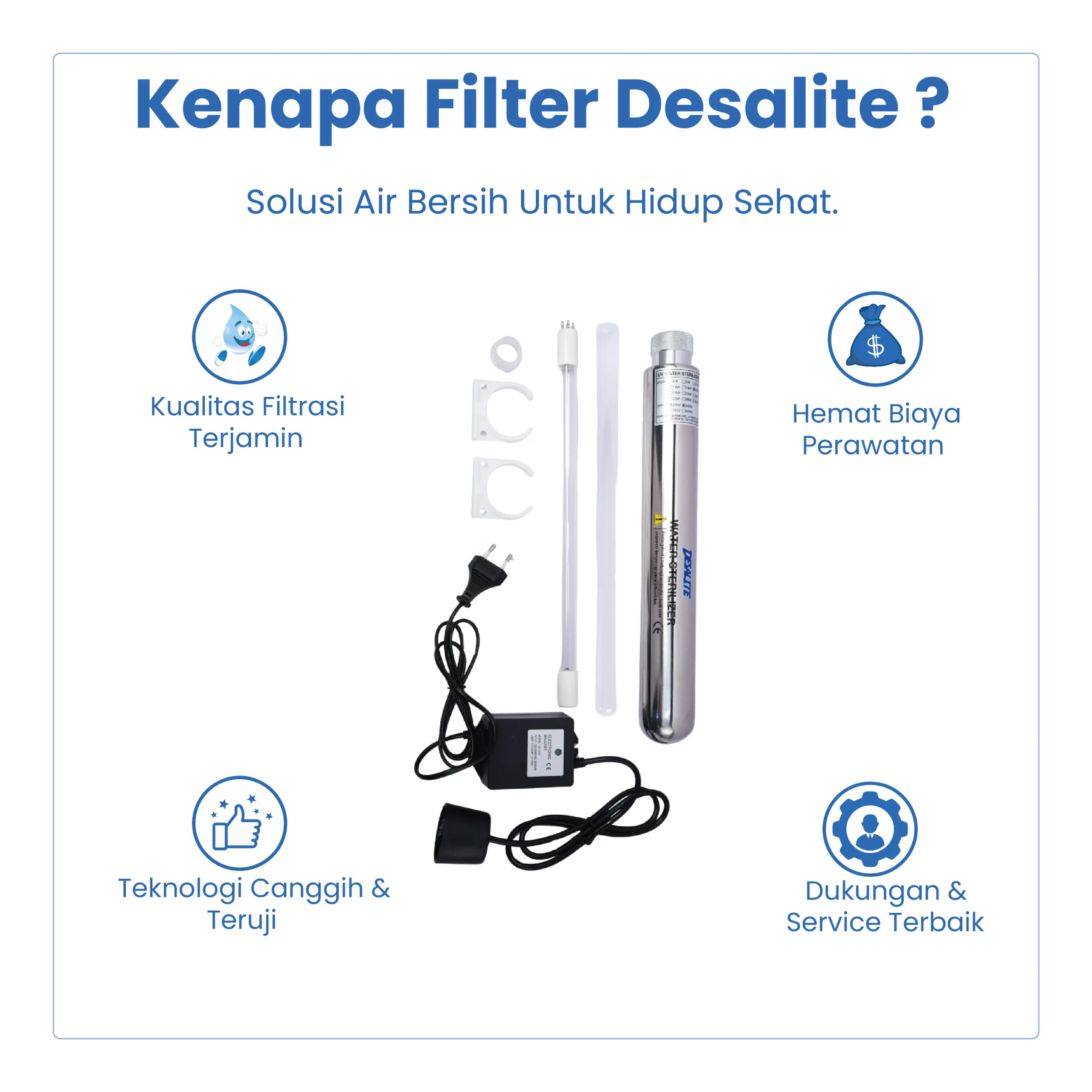 Dengan paket 1 set, instalasi menjadi lebih praktis karena sudah termasuk komponen utama UV sterilizer.