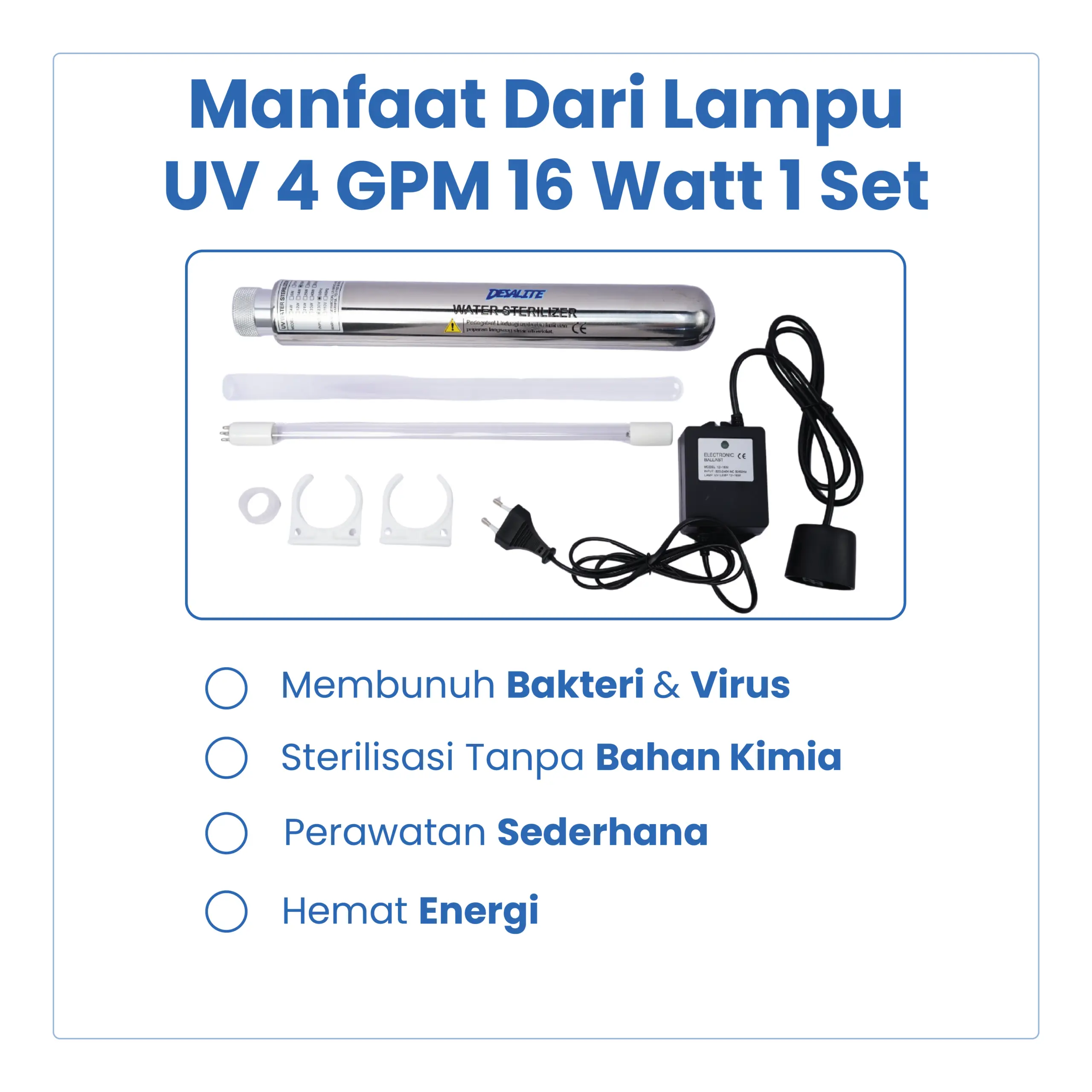Lampu UV 4 GPM 16 Watt 1 Set merupakan paket lengkap sterilisasi air yang digunakan untuk membunuh bakteri, virus, dan mikroorganisme dalam air menggunakan sinar ultraviolet. Set ini ideal untuk sistem Reverse Osmosis (RO), filter air, dispenser RO, dan instalasi water treatment rumah tangga maupun usaha kecil.