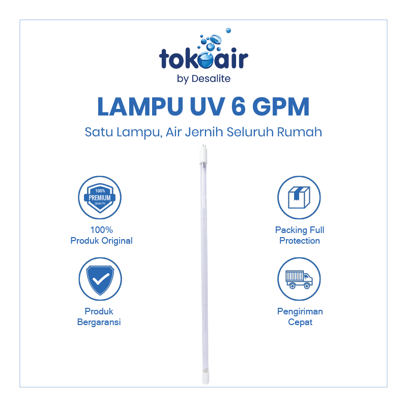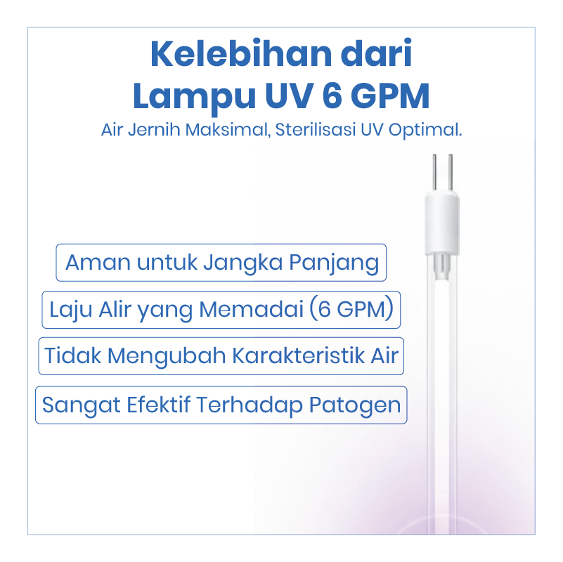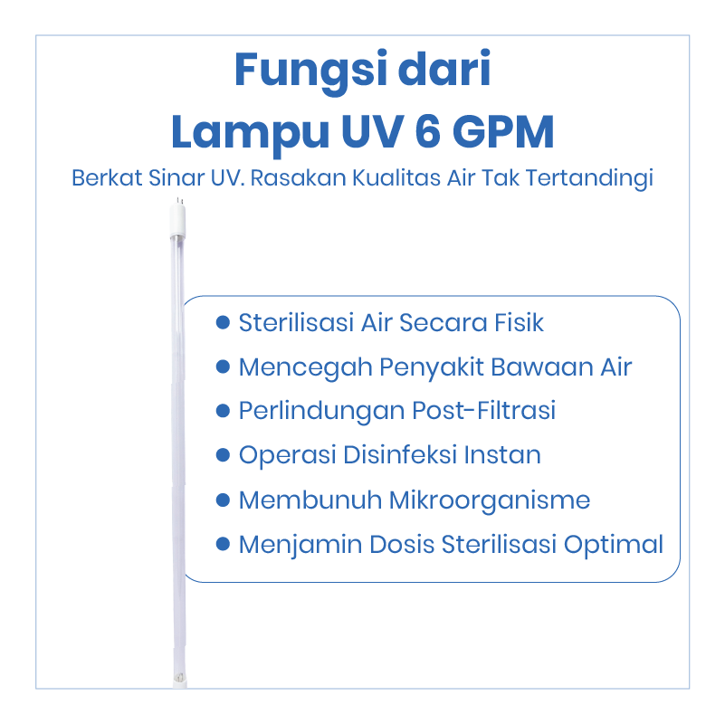 Lampu UV 6 GPM merupakan lampu sterilisasi yang berfungsi untuk membunuh bakteri, virus, dan mikroorganisme berbahaya dalam air menggunakan sinar ultraviolet tanpa bahan kimia. Lampu ini dirancang untuk sistem UV water treatment dengan kapasitas aliran hingga 6 GPM, sehingga air menjadi lebih higienis dan aman digunakan.