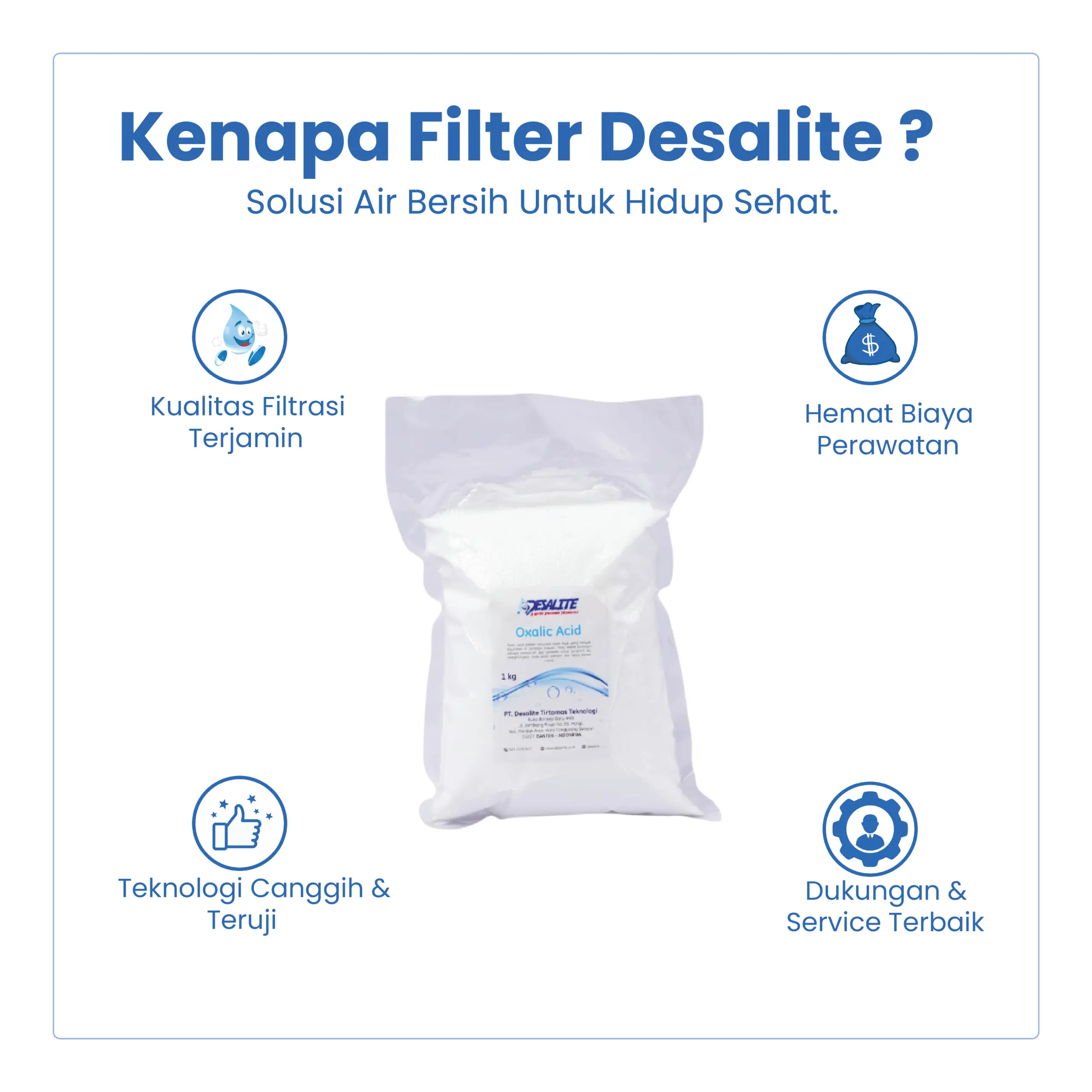 Oxalic Acid adalah bahan kimia pembersih yang digunakan untuk menghilangkan kerak, noda besi (Fe), mangan (Mn), dan endapan mineral pada sistem water treatment. Produk ini sering dimanfaatkan untuk perawatan filter air, membran RO, housing, tabung, dan peralatan water treatment lainnya agar kinerja sistem tetap optimal.
