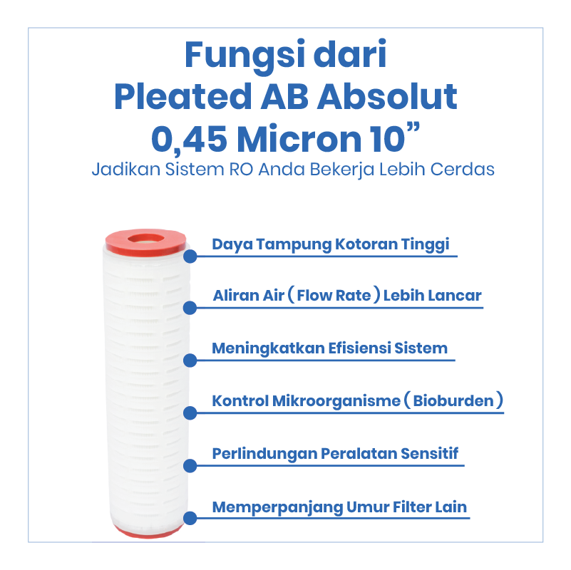Pleated AB Absolute 0,45 Micron 10” adalah cartridge filter presisi tinggi dengan tingkat filtrasi absolute, yang berarti ukuran partikel yang tersaring benar-benar sesuai dengan rating micron. Filter ini digunakan pada sistem water treatment, RO, dan filtrasi lanjutan yang membutuhkan hasil penyaringan akurat dan konsisten.