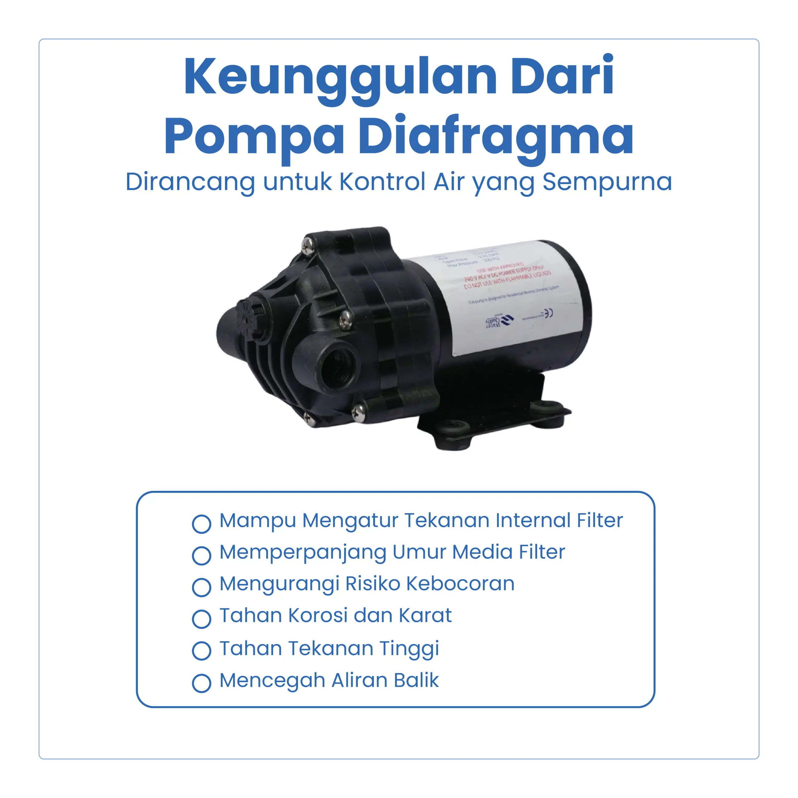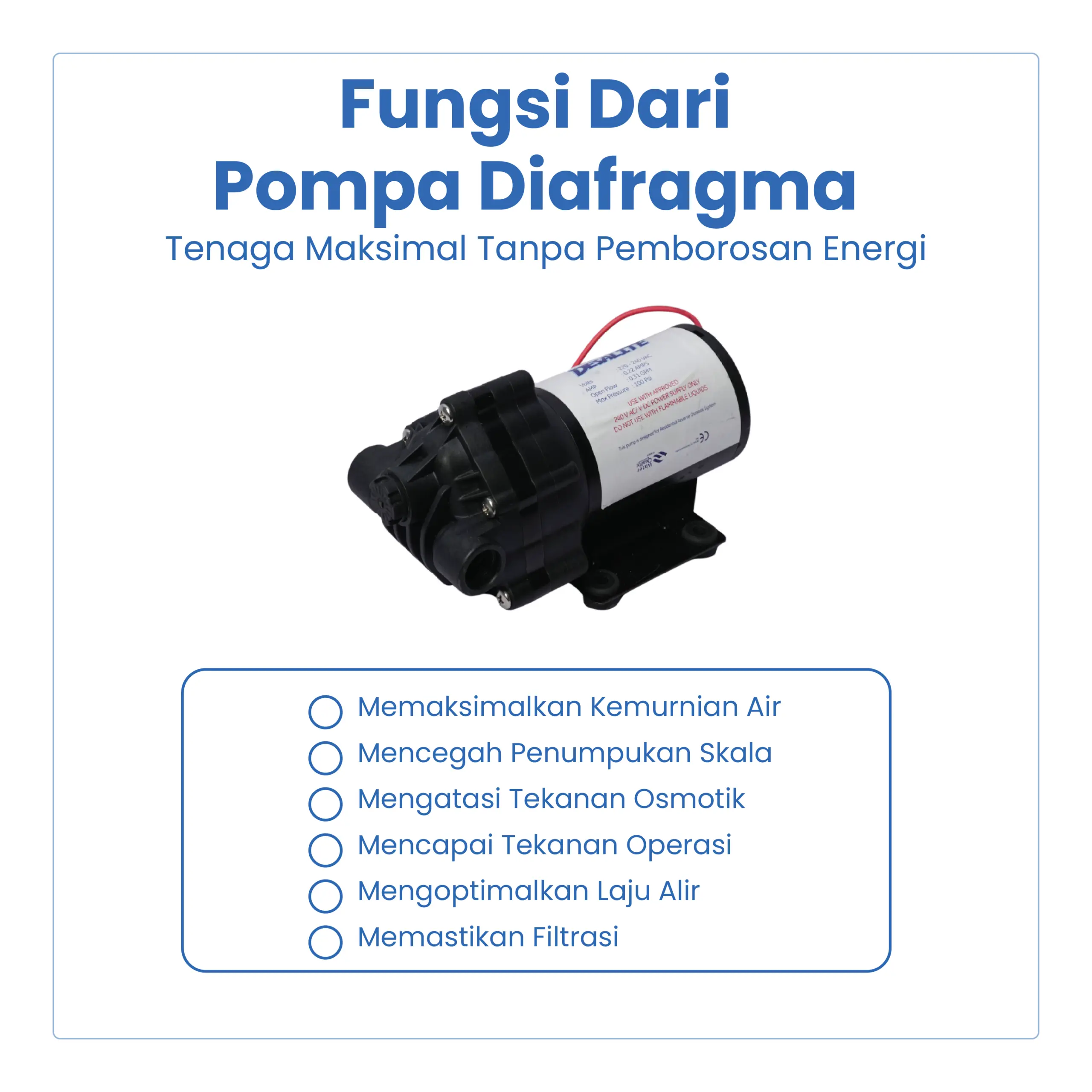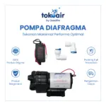 Pompa Diafragma merupakan pompa tekanan tinggi yang bekerja menggunakan sistem diafragma, dirancang untuk menghasilkan aliran air yang stabil dan tekanan konsisten. Pompa ini sangat ideal digunakan pada mesin RO, water purifier, depot air minum, serta sistem filter air yang membutuhkan tekanan optimal agar proses filtrasi berjalan maksimal.