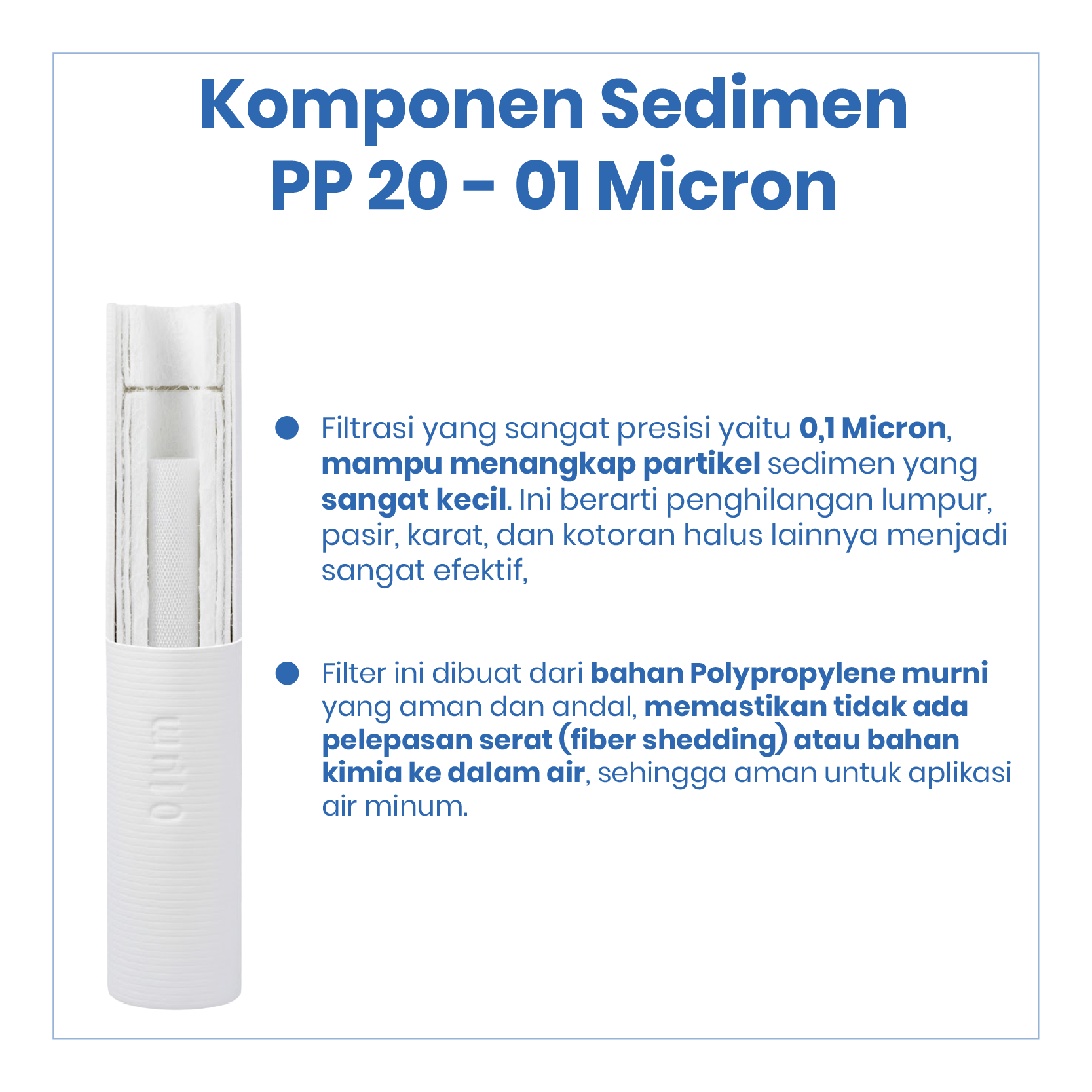 Sedimen PP 20” 01 Micron adalah cartridge filter berbahan polypropylene (PP) yang berfungsi menyaring partikel halus dalam air seperti pasir, lumpur, karat, debu, dan kotoran mikro. Dengan tingkat filtrasi 01 micron, filter ini memberikan penyaringan optimal sebagai tahap awal maupun lanjutan pada sistem filtrasi air.