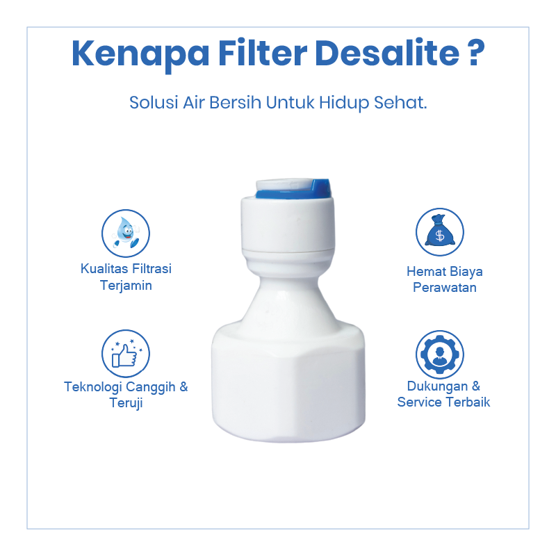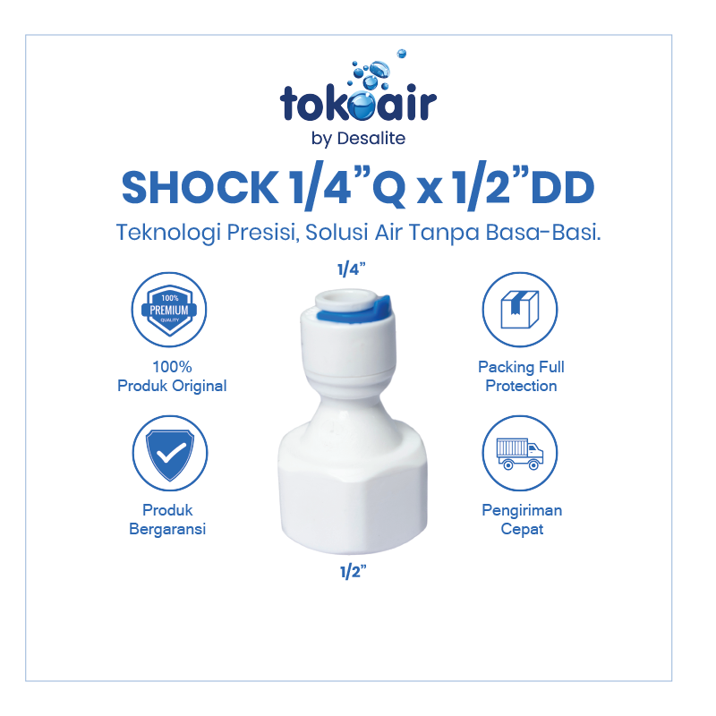 Shock 1/4” Q x 1/2” DD merupakan fitting lurus yang digunakan untuk menghubungkan selang RO 1/4” dengan komponen berdrat dalam 1/2” pada sistem Reverse Osmosis (RO) dan filter air. Fitting ini membantu instalasi menjadi lebih rapi, kuat, dan minim kebocoran.